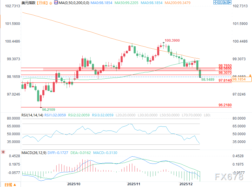 美联储将隔夜利率下调至3.5%-3.75%区间,这一决定遭到三名委员反对(反对降息)。这种意见分歧让交易员认为,此次降息对未来宽松政策的支撑力度有限。美联储主席鲍威尔强调,在再次调整政策前,美联储准备等待更多数据佐证。同时,美联储预测2026年仅会降息一次,这一预期进一步强化了宽松步伐放缓的信号。对于美元指数而言,收益率支撑减弱叠加美联储政策路径的不确定性,正不断侵蚀该指数的套利交易优势。